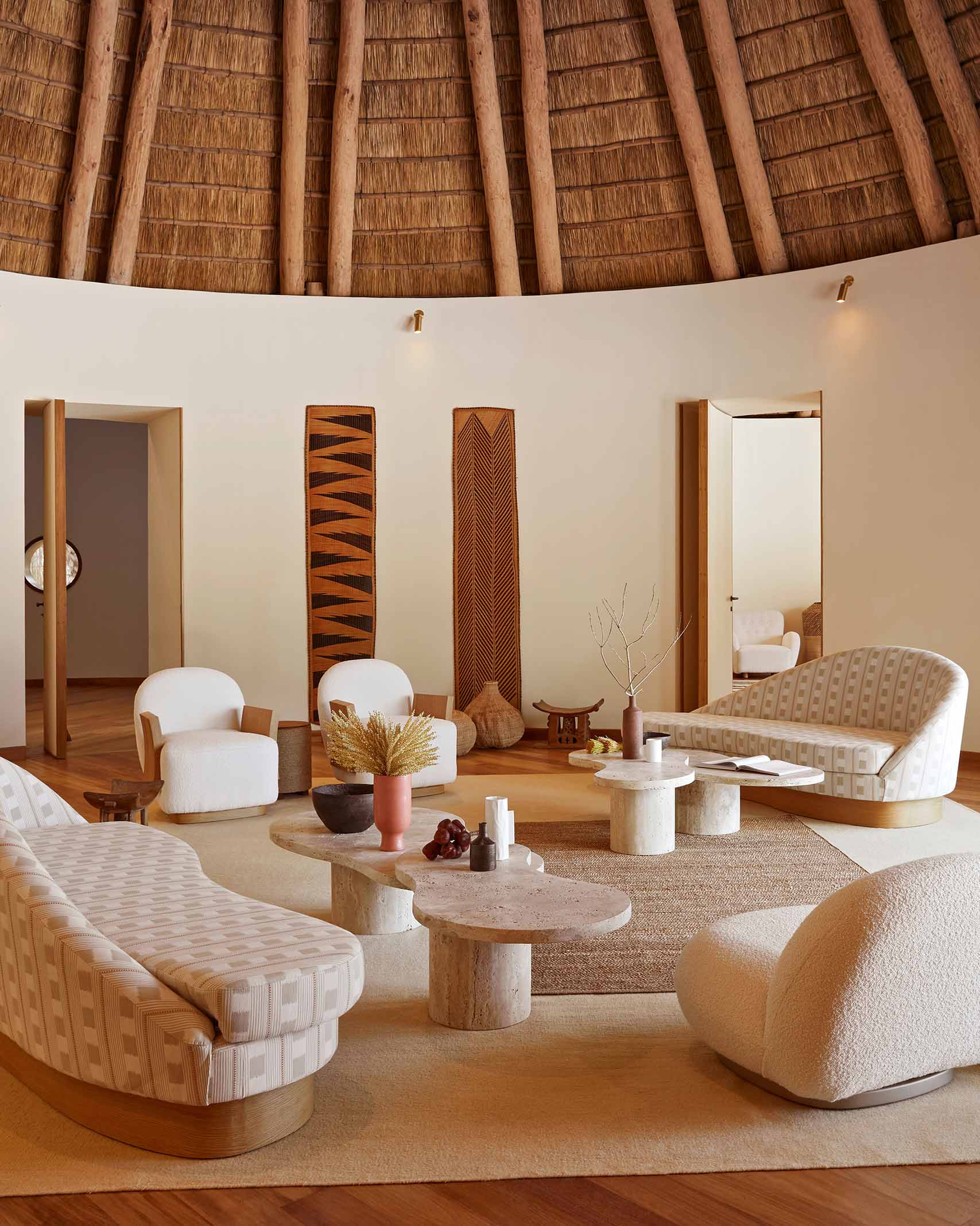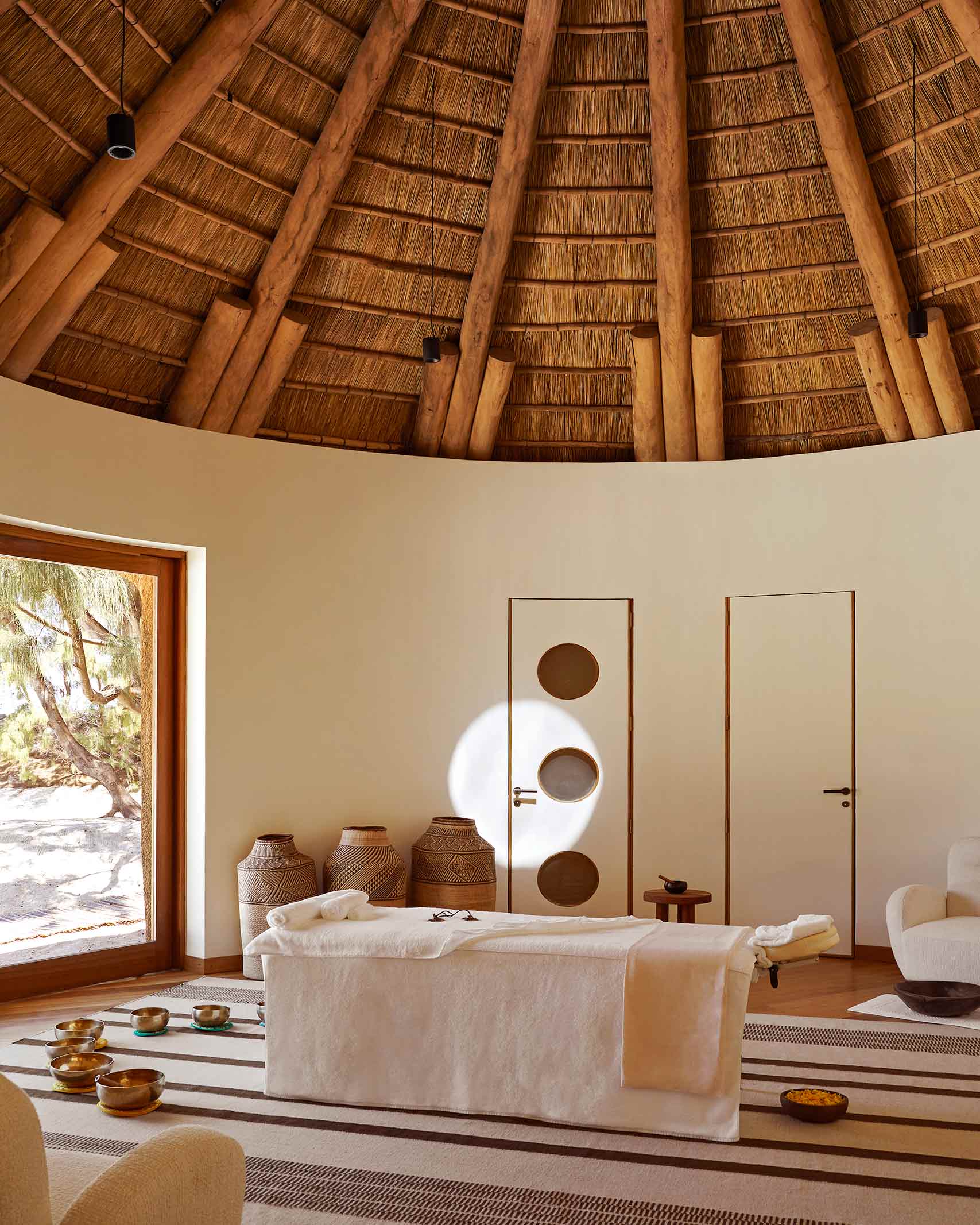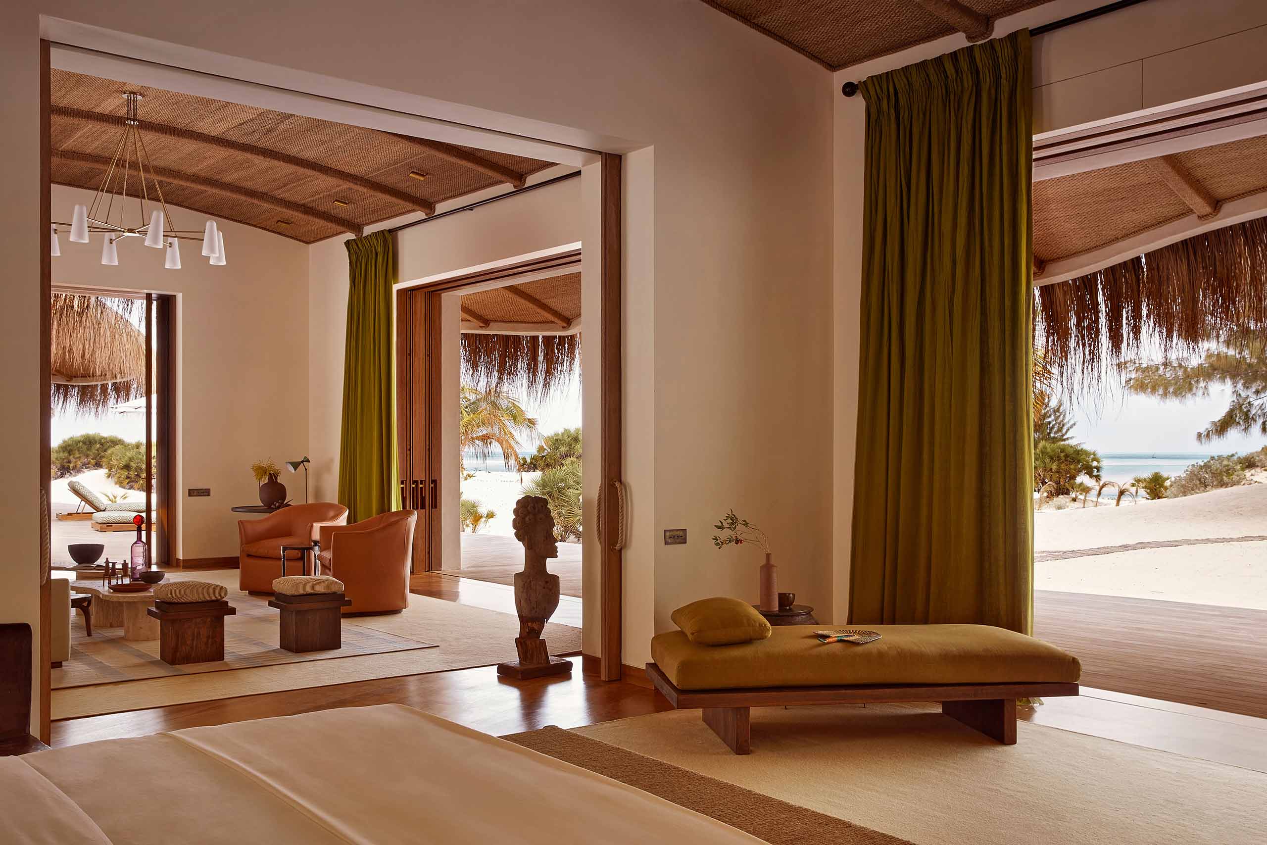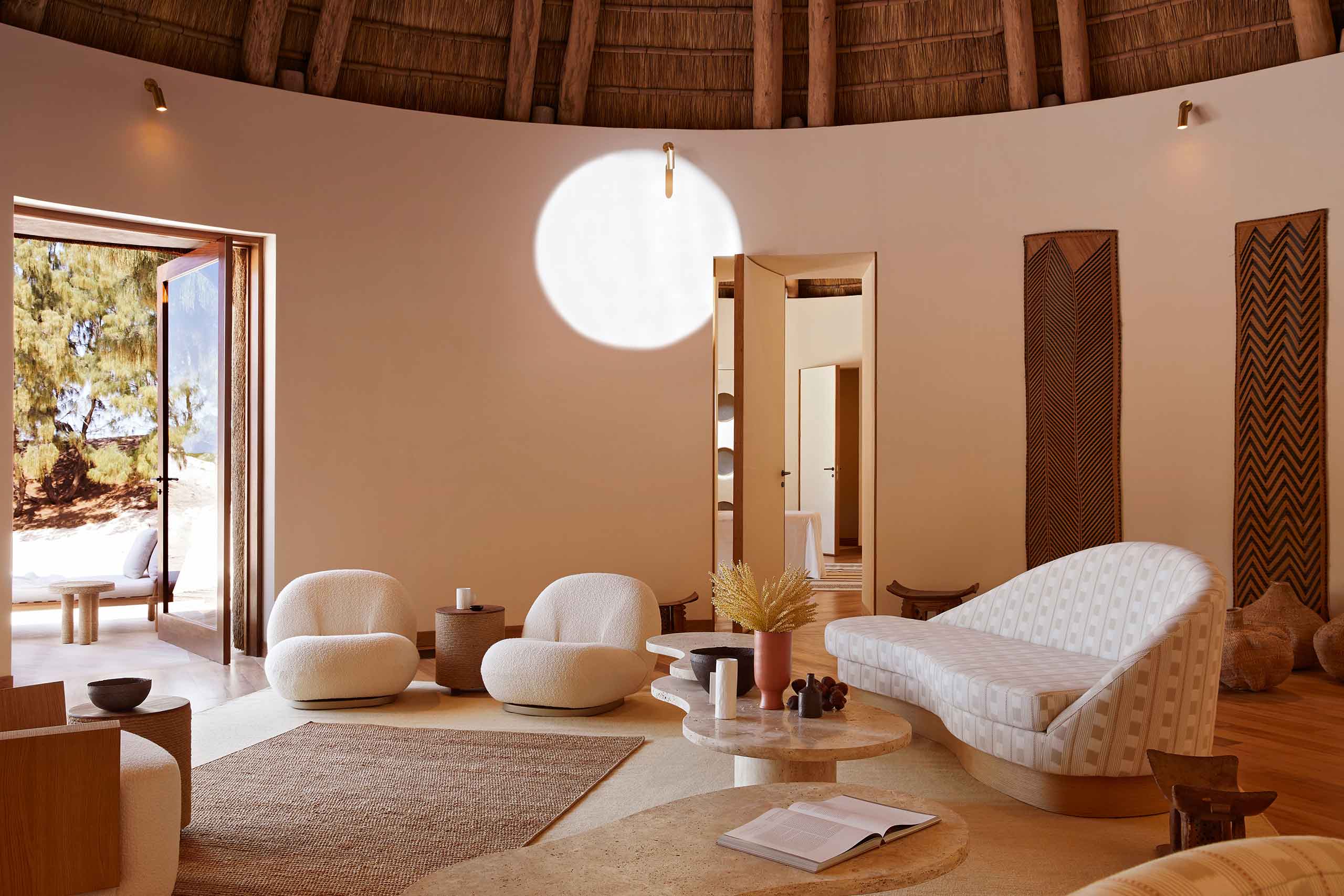 Plotted among eggshell-white sand dunes and coastal forests of whistling pines and milkwood trees, the residences, conjured by Flohr and her design studio, are far too vast to be called simply rooms or villas. Enfilade layouts thread living rooms into bedrooms and then into bathrooms larger than most city apartments. The design is all lean Modernist curves, with pan-African influences and natural materials such as native grasses and East African mahogany. Some building elements, including part of the residences’ foundations, were created by an on-site 3D printer, which uses a custom mortar of sand and seawater. The scale is impressive and everything is top quality, from door handles fashioned to look like nautical rope to barrel-vaulted ceilings covered in a weave of jute-like plant fibre. At high tide, a near-perfect beach is steps away from most residences (ours was Cove 5). For both beach and forest views, we recommend Cove 4, which sits on a small bluff.