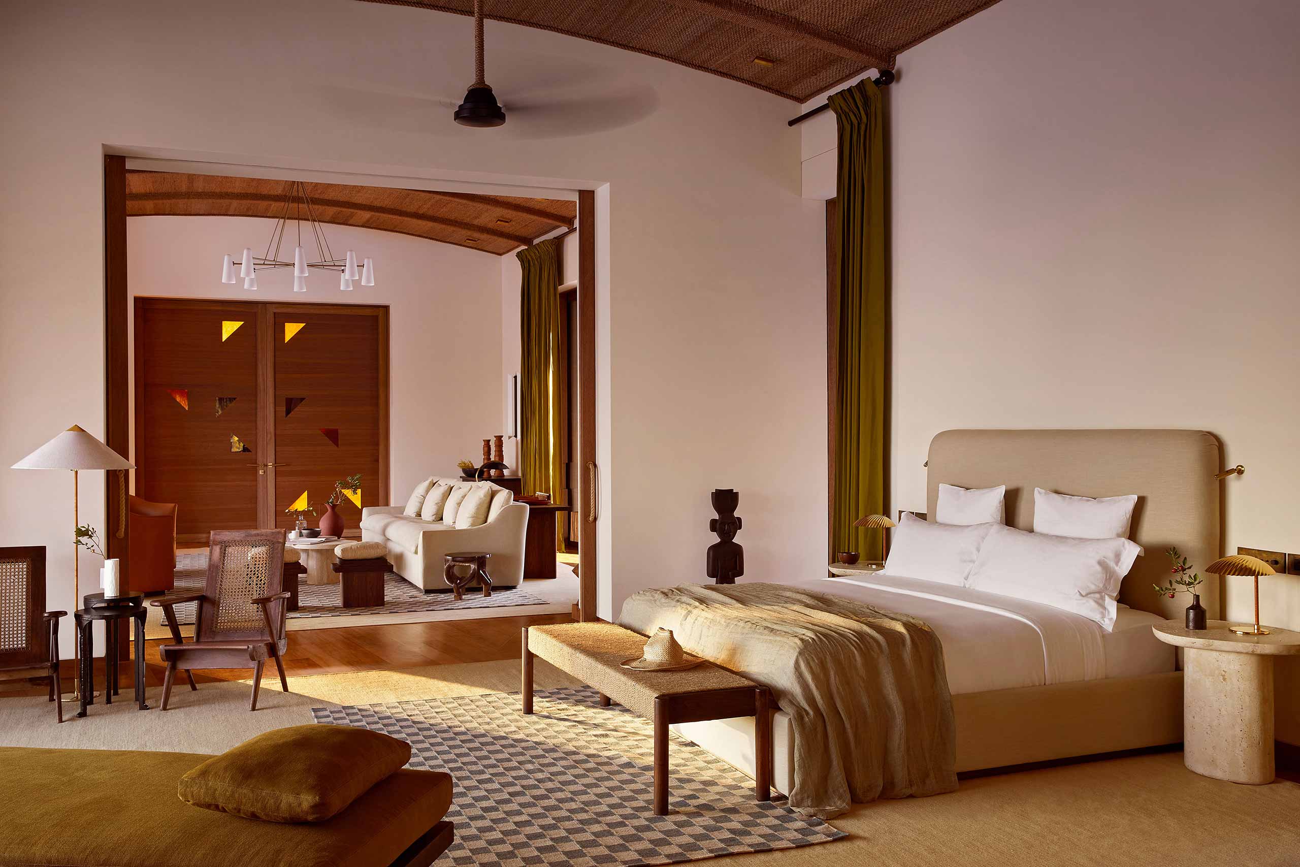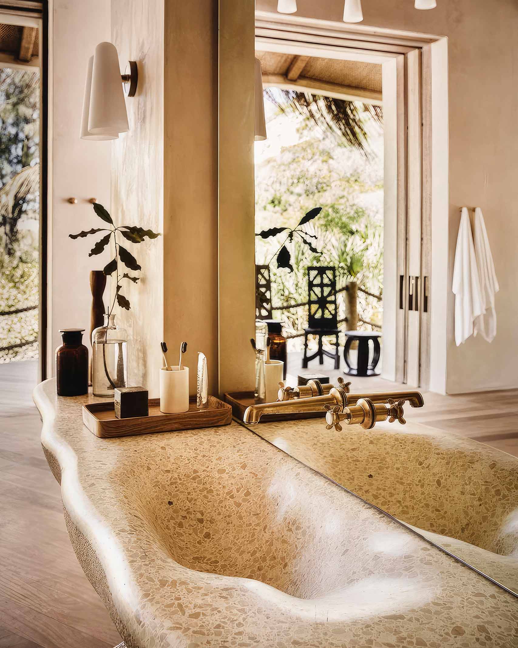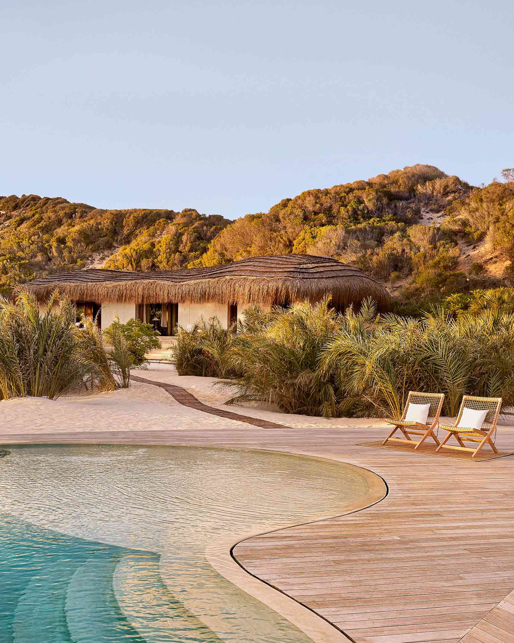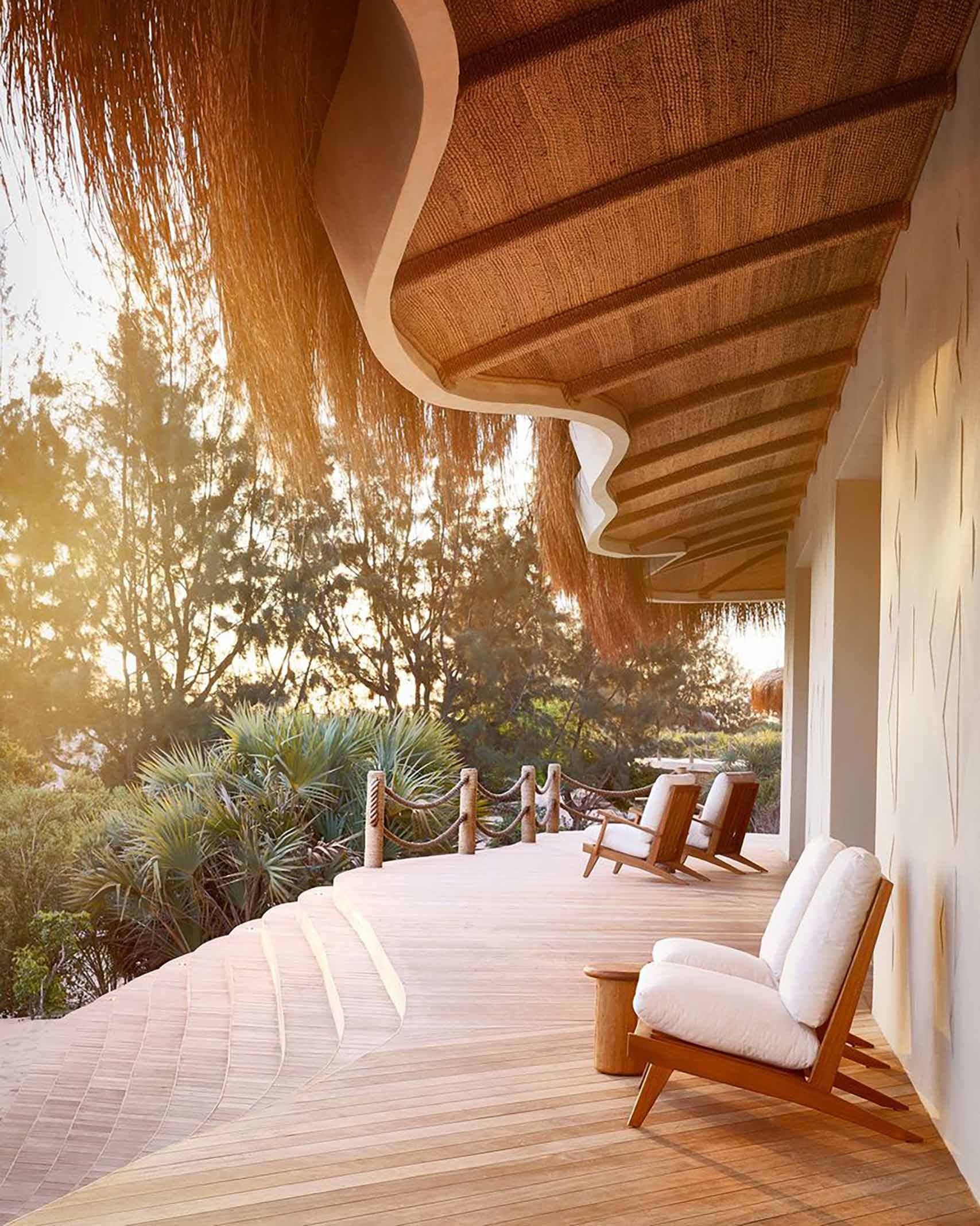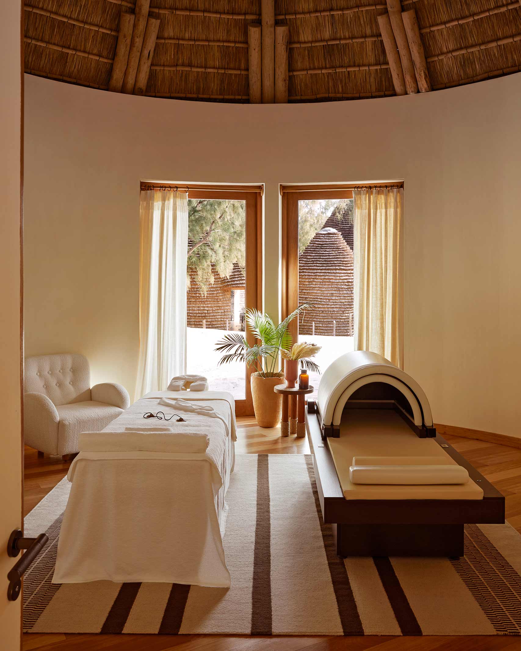 Plotted among eggshell-white sand dunes and coastal forests of whistling pines and milkwood trees, the residences, conjured by Flohr and her design studio, are far too vast to be called simply rooms or villas. Enfilade layouts thread living rooms into bedrooms and then into bathrooms larger than most city apartments. The design is all lean Modernist curves, with pan-African influences and natural materials such as native grasses and East African mahogany. Some building elements, including part of the residences’ foundations, were created by an on-site 3D printer, which uses a custom mortar of sand and seawater. The scale is impressive and everything is top quality, from door handles fashioned to look like nautical rope to barrel-vaulted ceilings covered in a weave of jute-like plant fibre. At high tide, a near-perfect beach is steps away from most residences (ours was Cove 5). For both beach and forest views, we recommend Cove 4, which sits on a small bluff.