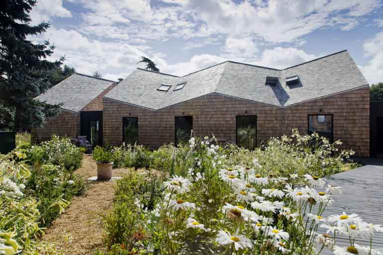 Over the next two years, David and Bruce worked closely with the architects, their local builder and tradesmen to turn the site into a stunning, modern, purpose-built guest house set into the five acres of natural woodland. The building features multiple pitched roofs, which while reminiscent of a country church, give the structure a strong identity. It is entirely clad in hundreds of Canadian cedar shingles which help visually to tie it beautifully into its woodland surroundings; a process that their builder was more than happy to allow Bruce and David to get involved with.