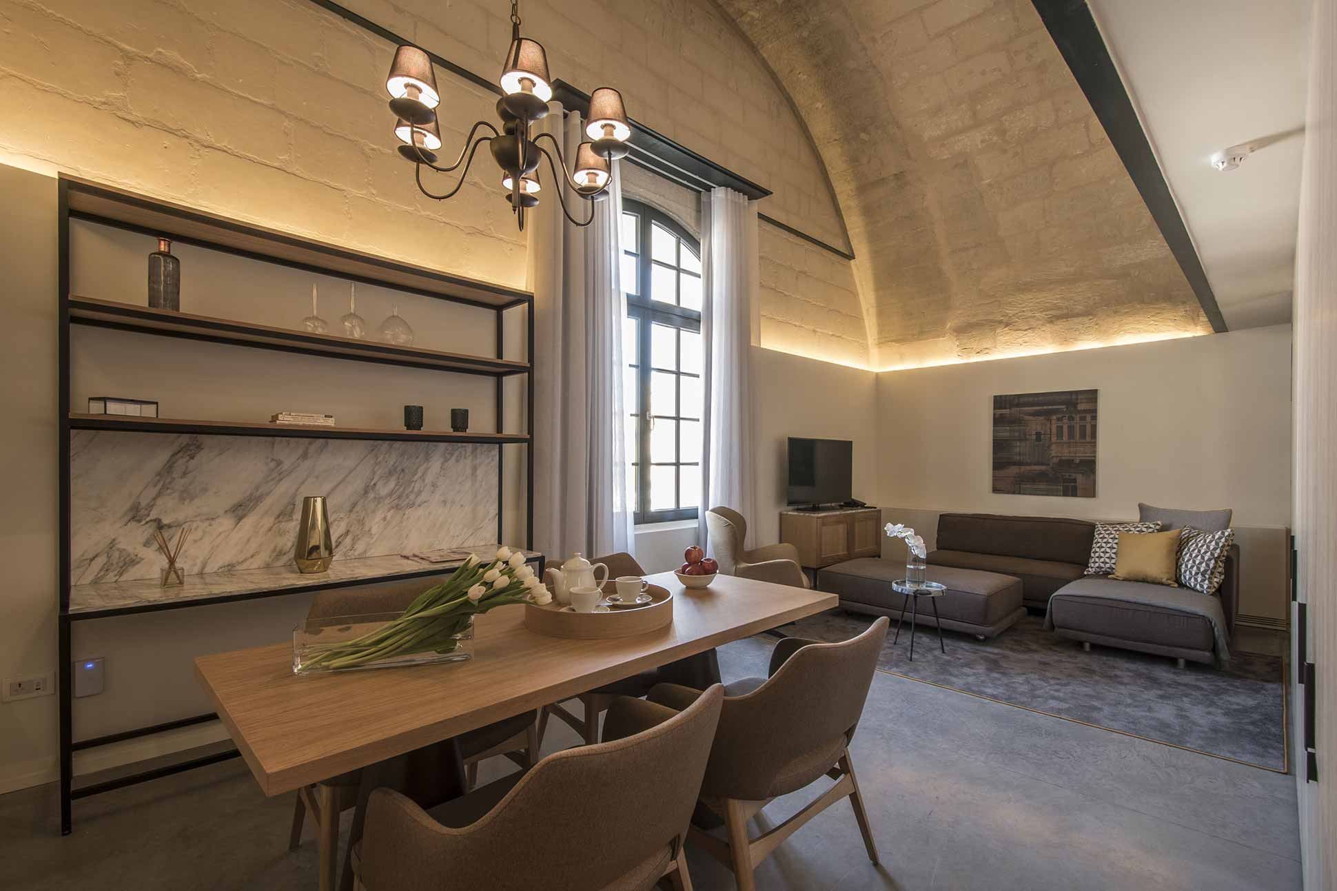 Like many heritage hotels in Malta, no two rooms are identical as they had to build around preservation orders (one also has to appreciate that the construction of the Cugo Gran Macina took an astounding 17 years). So, there are some suites that are duplexes with mezzanines, presenting a cosmopolitan and urban apartment vibe, yet abounding in period features like original limestone ceilings, tunnels and archways. The downside is that you’re literally breathing in history in these spaces, the limestone is prone to erosion and hence it flakes, so for those with allergies or aversion to dust on your luggage, opt for a room with a new ceiling.