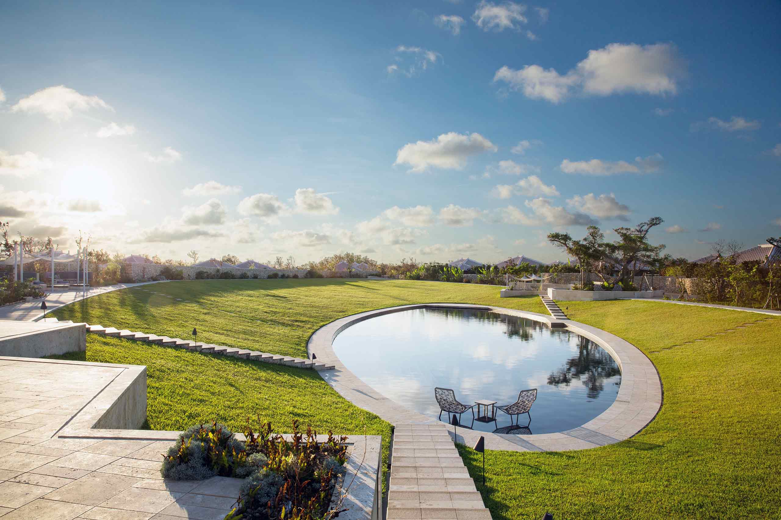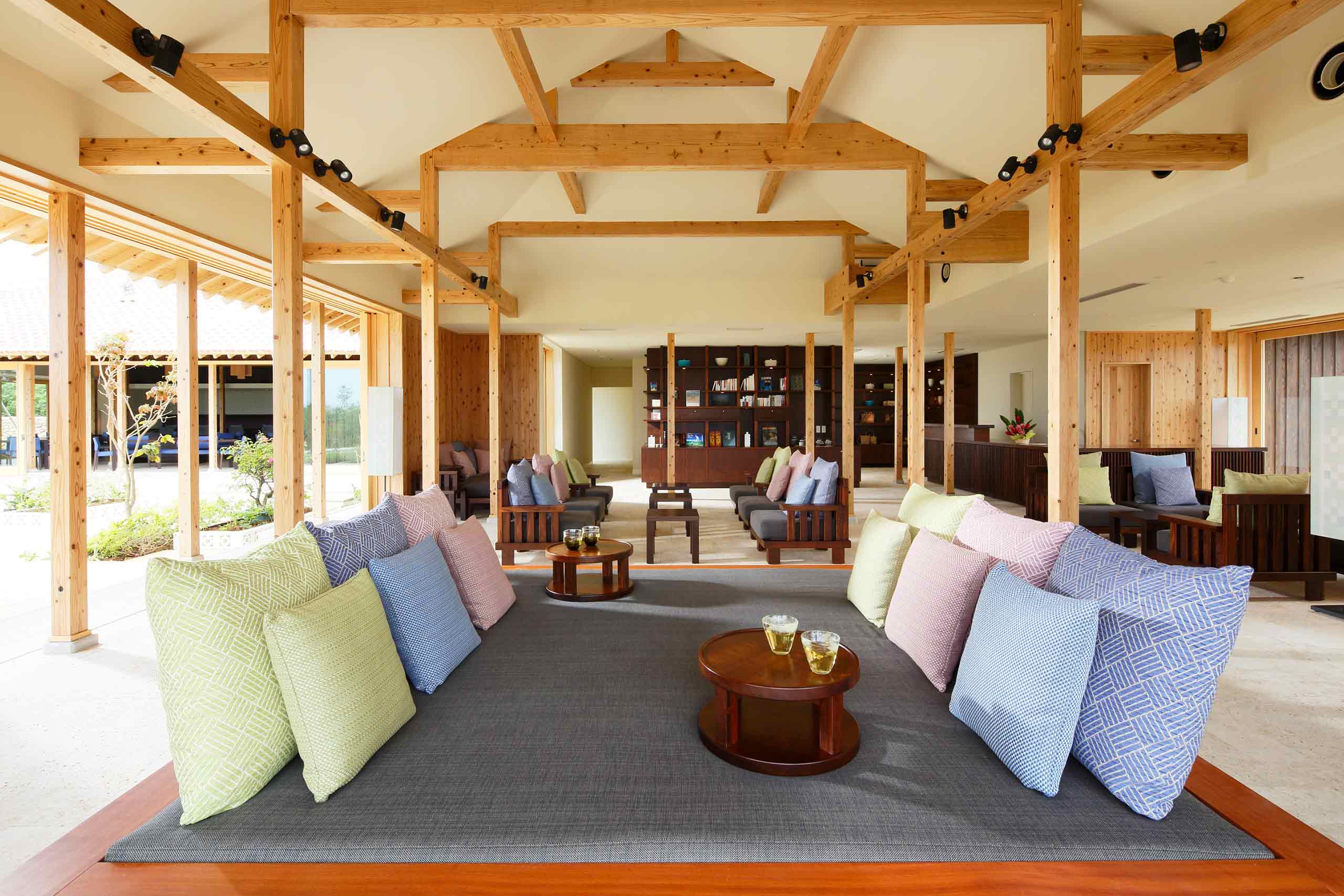 Following one of the generous grounds’ meandering white-sand paths, also a feature of the village’s aesthetics, we found the heart of the resort, the airy Yuntaku Lounge, which is flanked by a compact restaurant, and an oval-shaped, 46m landscaped pool cradled by a manicured, sloping lawn, ancient banyan trees and a shaded terrace. The lounge hosts daily performances of traditional Okinawan songs accompanied on sanshin, a banjo-like three-stringed instrument, and has a bijou library, whose books (generally in Japanese, but with lots of great archive photography) give further insights into the island’s history and culture.