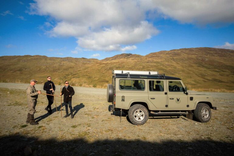 Standing by his moss-coloured Land Rover Defender (the cleanest, most impeccable off-roader that I’ve ever seen) is Yuri Janssen, Gleneagles’ country sports manager, dressed in characterful country gear: tweed shooting breeks with boot socks pulled over them, checked shirt, a creaseless Gleneagles branded teal fleece and Baker Boy cap, perched perfectly on his head, somewhat tilted like an army-man’s beret.