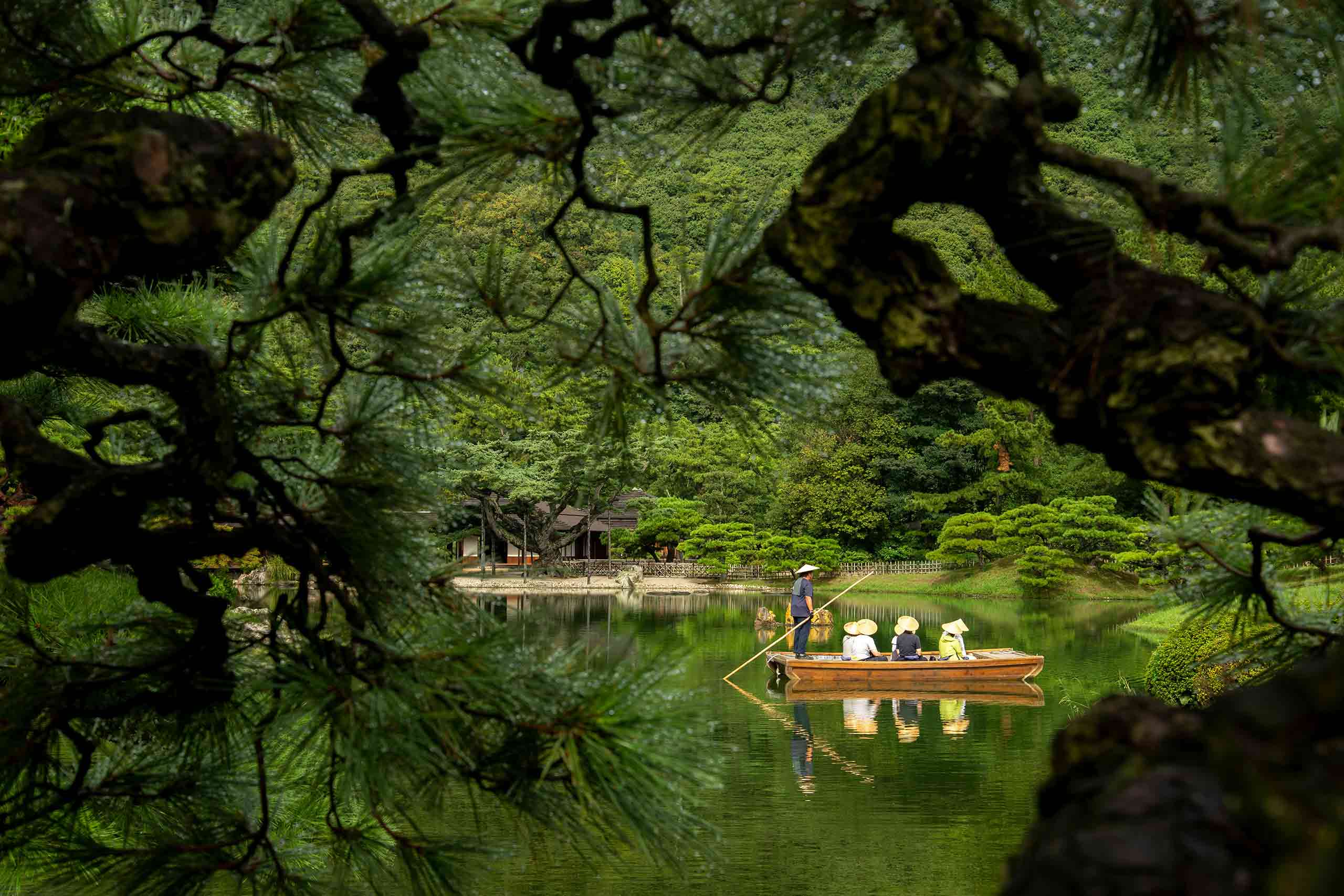A boatman steers a boat with 6 passengers, they're all wearing rattan hats. They glide on a green lake, frame by incredible greenery in Japan. The image is an example of milestone travel