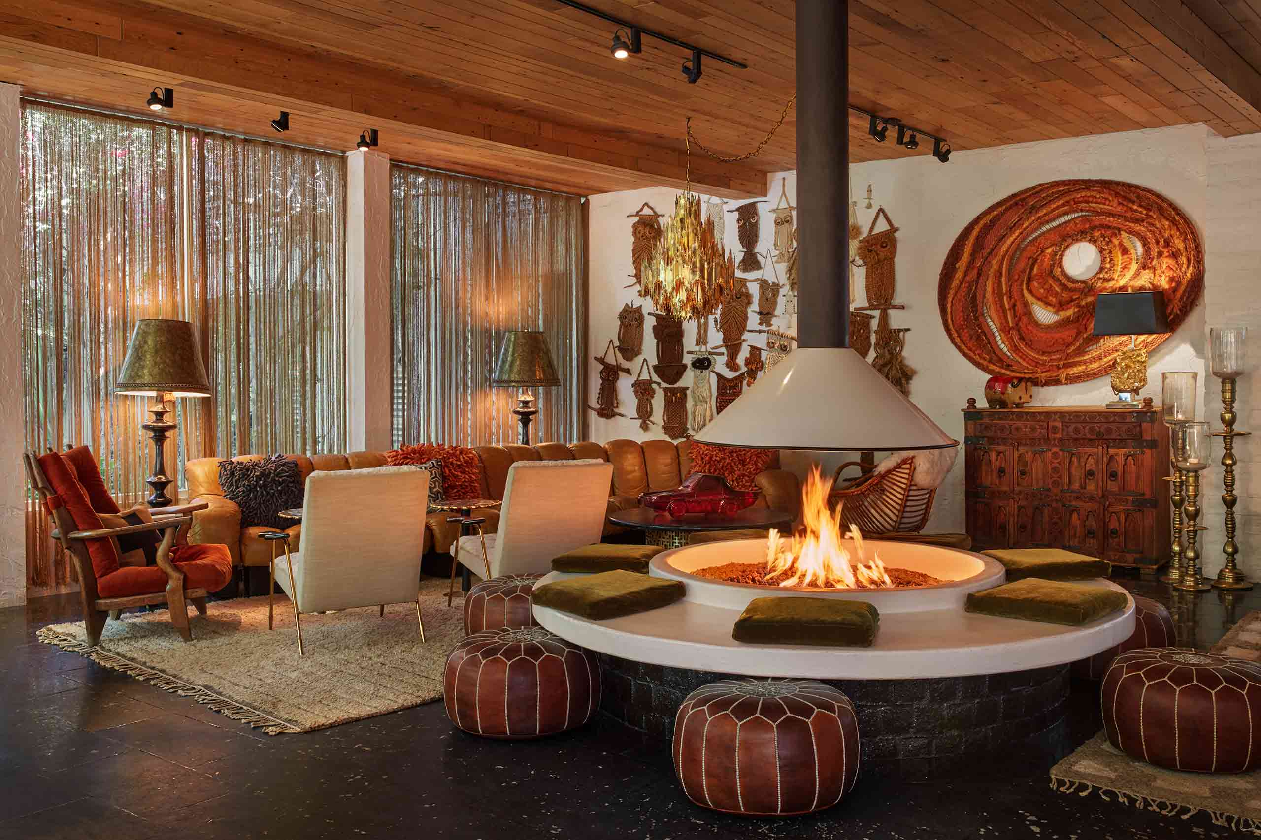 At the Parker, this manifests in totality as a kind of curated chaos. Nothing feels accidental, yet everything feels slightly surprised to be there. Suits of armour stood casually as if they were waiting for us to offer them a cocktail. An impossibly large vintage drug store sign (it reads “Drugs”) took centre stage, with a hint of nostalgic optimism and a nudge-nudge wink-wink of the party-hearty set today. Upcycled mirrored coffee tables played right into it, reflecting not just the room but our increasingly confused sense of reality. There are African masks, curious pottery, Tiki references, iconic bric-a-brac, fire pits, Regency sofas and objects that appear to have wandered in from entirely different aesthetic universes and thought, “you know what, we’re going to hang out here”.