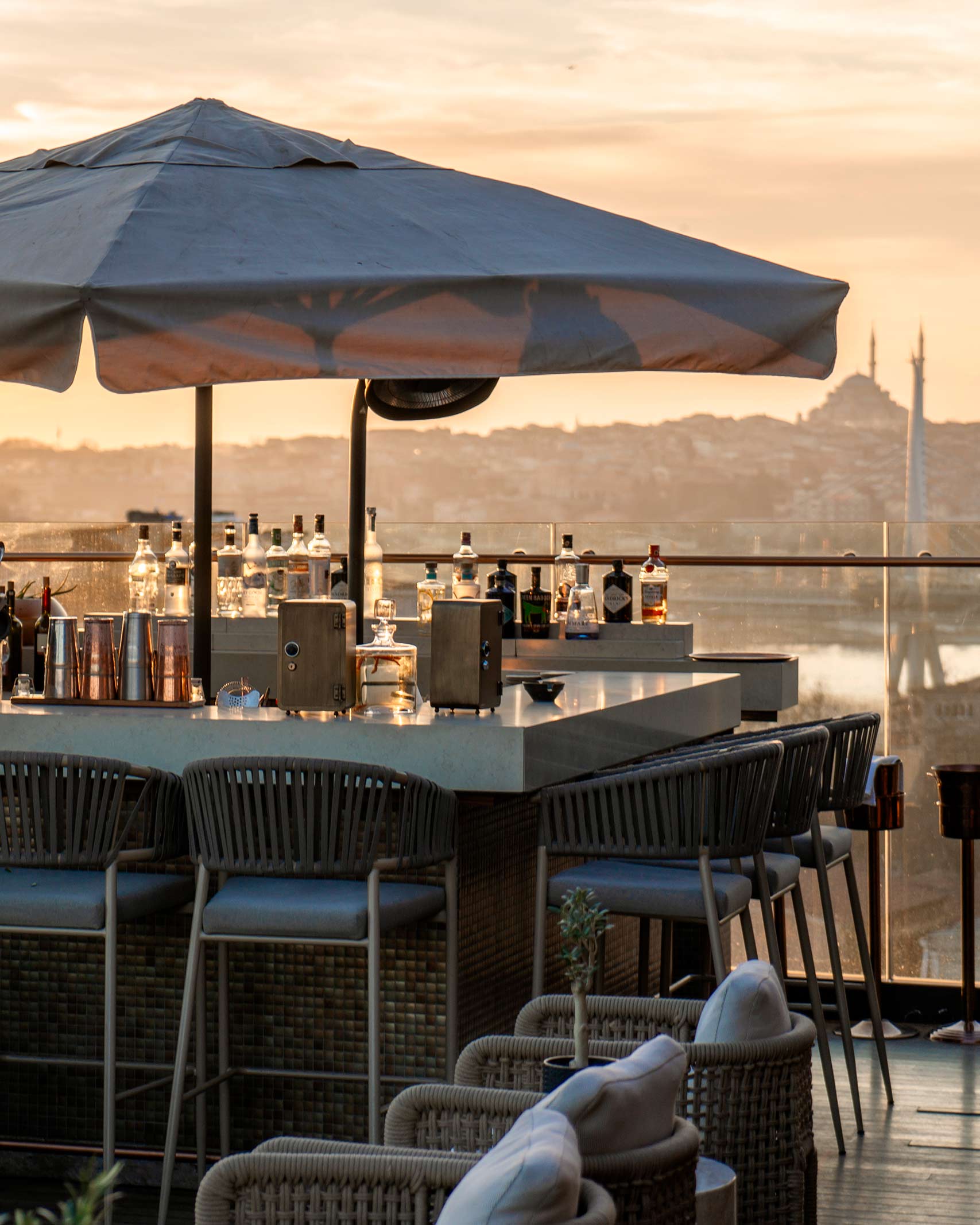 Beautiful though as they may be, the rooms likely aren’t what travellers book a trip for, and thanks to its three food and beverage outlets – The Lobby Bar & Restaurant, The Bank Rooftop Bar, and Serica by Chef Yiğit Alicioğlu – The Bank Hotel Istanbul taps right into the cerebral artery of culinary Türkiye, with its significant touristic allure. We loved the stylish rooftop bar, which offers views over the Bosphorus beyond whose shores Sultanahmet’s world-famous mosques glisten in the evenings. Somewhere between a Shazam-inducing playlist of lounge music, lights swinging in the breeze above our table and our low seating, there seemed an intention by the hotel to create a seductive, grown-up atmosphere that felt a tad more risqué than the stylish yet friendly interiors elsewhere across the property. Our cocktail, served in a miniature bank vault filled with fog, came with blueberry-infused, purple olives and dehydrated peas, and tasted expectedly divine.