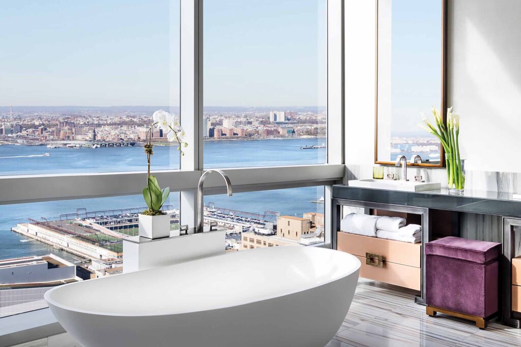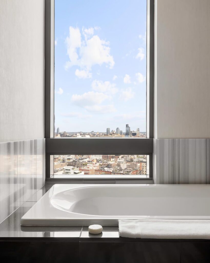 Our Skyline View King room at The Dominick was generously proportioned by New York standards. At 40 sqm/425 sqft at entry level, it felt more like an NYC pied-à-terre than traditional hotel accommodation. There was a distinct residential quality to the layout, kept simple to make the most of the building’s lofty perch. Our bathroom was clad in marble and again, surprisingly spacious, with a huge, deep soaking tub that could easily seat three (well, it is NYC after all!) and is all about the view. Le Labo amenities seal the deal, naturally.