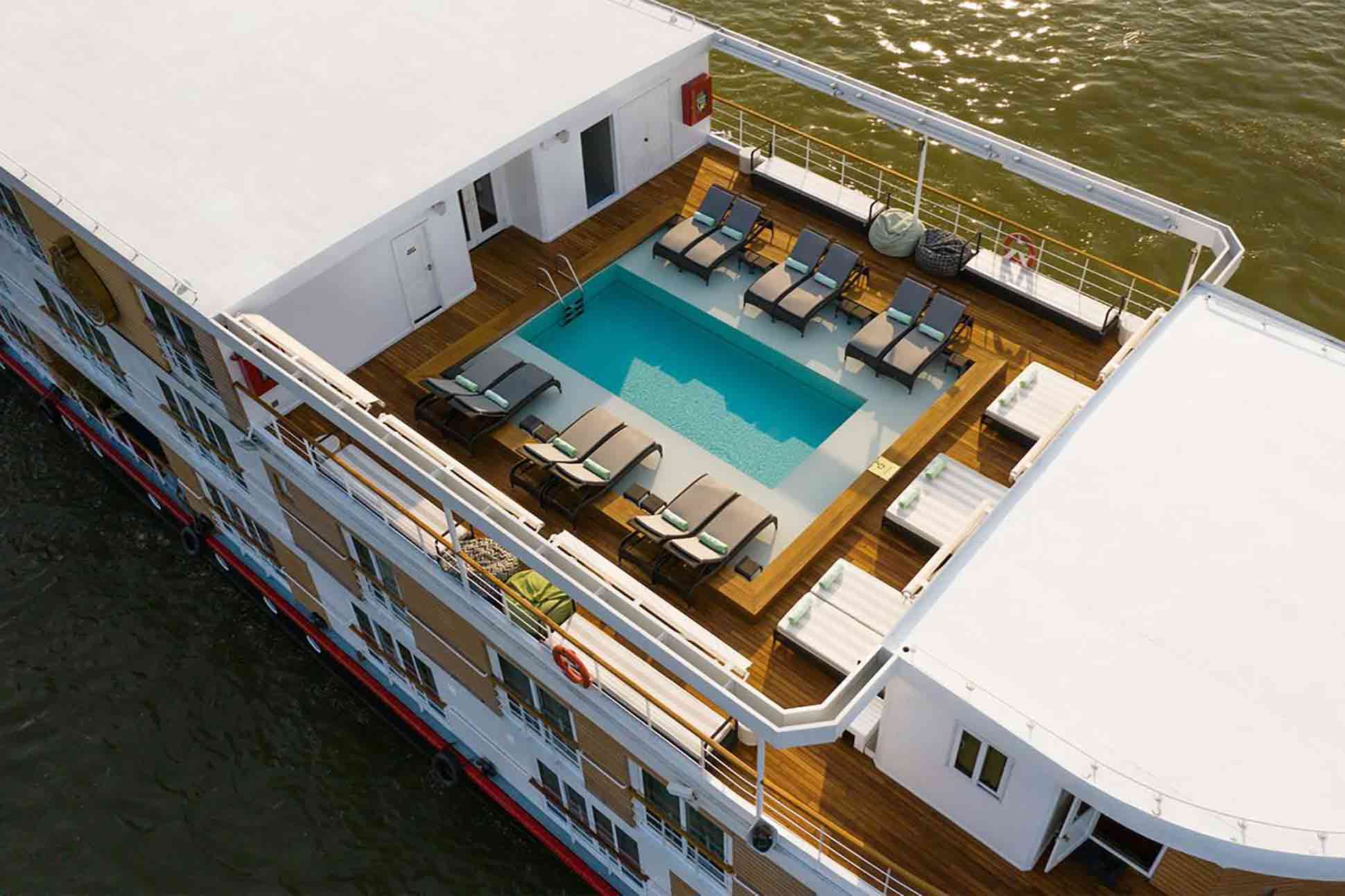 The rest of the Strand Cruise ship was also gorgeously appointed. A showcase staircase separated three floors. On the upper deck was the sprawling Sarkies Bar, a lounge-like, brown-leather space that brought out the raconteurs in us, a perfect place to socialise and swap stories with other adventurers. The bar led out to the terrace and pool deck, where we spent most of our time between shore excursions, topping up our tans, reading and doing absolutely nothing – with a glass of something alcoholic in hand – watching the sunsets, the life on the river and thousands of temples and pagodas pass us by. On the middle floor was the dining room and curated boutique, as well as a small spa. Downstairs, we even found a well-equipped fitness centre, much to our amazement.